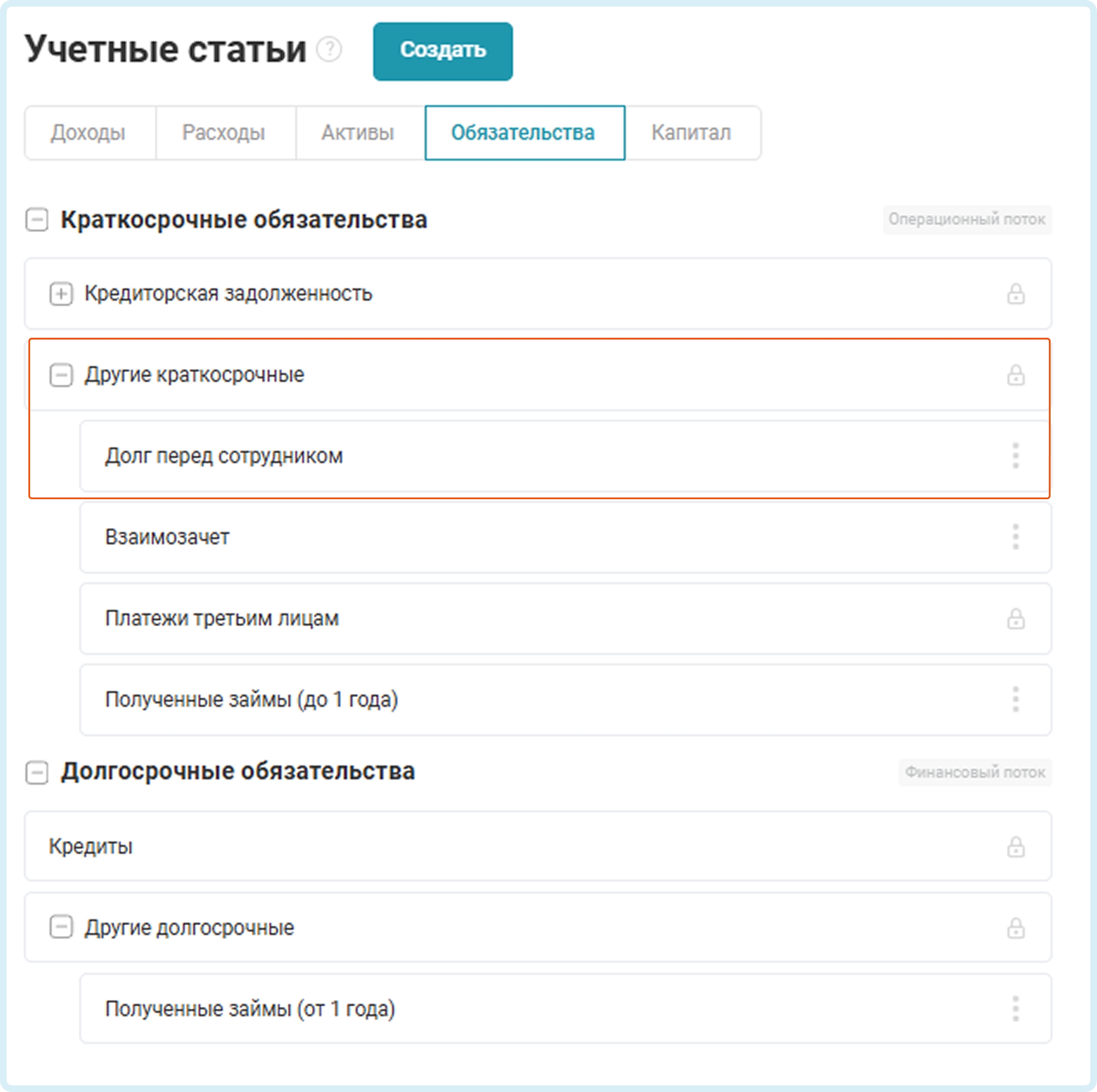 В разделе Справочники - Учетные статьи - Обязательства - Краткосрочные обязательства создаем статью, которая будет отображать долг по зарплате перед сотрудником, Долг перед сотрудником.