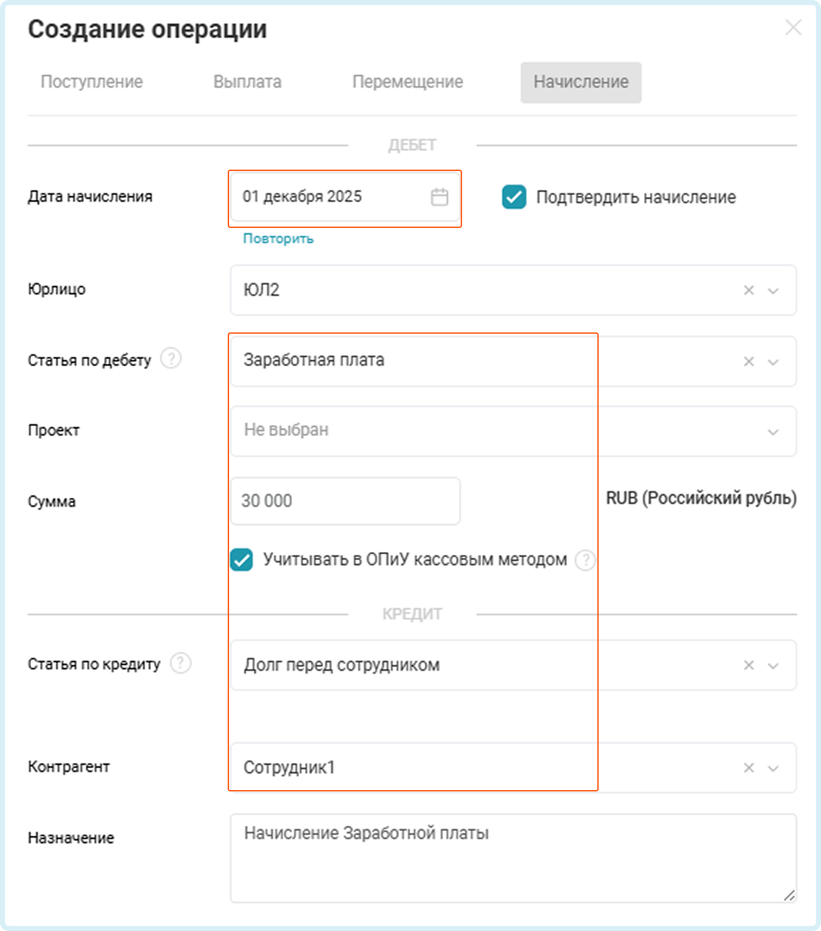 1. Сотруднику 1 декабря начислена зарплата за декабрь в размере 30000р. Для этого создаем операцию Начисление - статья по дебету Заработная плата, статья по кредиту Долг перед сотрудником.
